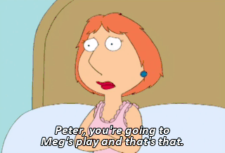 Peter, you're going to Meg's play and that's that. Is that that now, Mrs. That's that? If you're gonna shoot me, you might want to tie your shoelaces first.