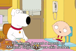 You know, I spent a month as Melanie Griffith's loose skin holder. Melanie! Melanie! Over here. You look beautiful. Can't hold on much longer. (ALL GASP) I should have stayed in bed.