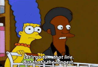 Let's go to... that line. But that's the longest. Yes, but look-- all pathetic single men. Only cash, no chitchat. Mmm! Seventy-five, 85, 90 and a dollar. Thank you and come again. Hey, wait a minute! Hey!