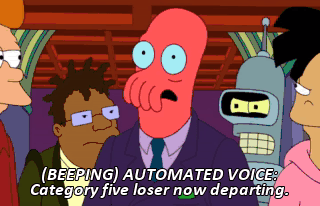 (BEEPING) AUTOMATED VOICE: Category five loser now departing.