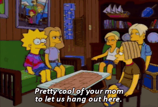 Pretty cool of your mom to let us hang out here. Totally. Not like my mom. She'd be butting in with Rice Krispies squares and Tang.