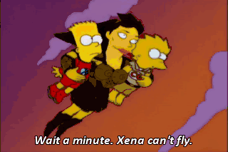 Wait a minute. Xena can't fly. - I told you. I'm not Xena. I'm Lucy Lawless. - Oh. Wow, Joe Namath! That's right. My car broke down in front of your house. Yo, dudes! Awesome show.