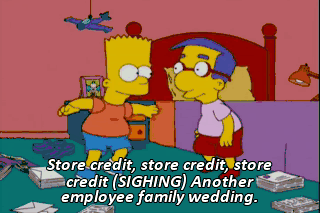 Store credit, store credit, store credit (SIGHING) Another employee family wedding.