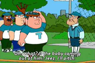 Oh, what? Is the baby coming out of him? Jeez, I'll pitch.