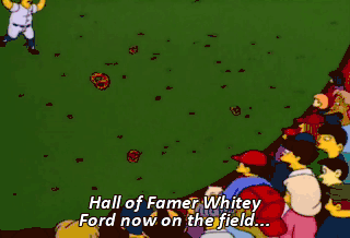 Hall of Famer Whitey Ford now on the field... pleading with the crowd for-- for some kind of sanity. Uh-oh. And a barrage of pretzels... now knocking Whitey unconscious.