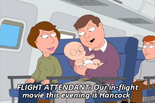 FLIGHT ATTENDANT: Our in-flight movie this evening is Hancock.