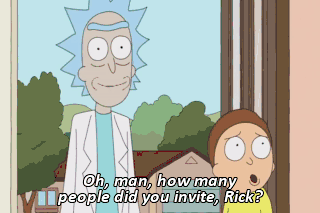 Oh, man, how many people did you invite, Rick? Uh... people? Mm, six. Ya! What up, my Glip Glops?! Oh, man!