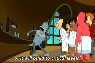 or it will build to critical levels! (GASPS) You don't mean... Oh, but I do. If you stop partying for a single second, you'll explode and kill everyone here in a fireball of melted gears and splattered bowels!