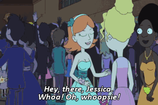Hey, there, Jessica. Whoa! Oh, whoopsie! Oh, my god, Morty. You look really nice tonight. Wow, thanks. I love you, Marty! I love you so much it burns! Oh, man! l-l love you too, Jessica!