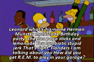 Leonard what's-his-name Herman Munster motorcade Birthday party, Cheetos pogo sticks and lemonade You symbiotic stupid jerk That's right, Flanders I am talking about you How did you get R.E.M. to play in your garage?