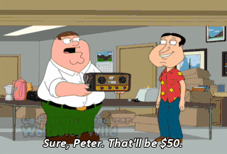 Sure, Peter. That'll be $50. Fifty bucks? All right, fine. I'll buy it. Man, this is a bigger rip-off than Shrunky Dinks! They already been shrunk. Happy Birthmas.