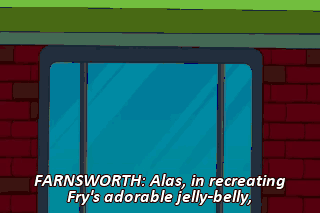 FARNSWORTH: Alas, in recreating Fry's adorable jelly-belly, she had overstuffed him with copper wadding. The inevitable static discharge electrocuted Leela, and destroyed both of their short-term memories.