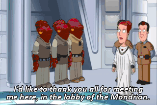 I'd like to thank you all for meeting me here, in the lobby of the Mondrian. Hey, check it out, it's another chick! The only other chick in the galaxy. I don't like her.