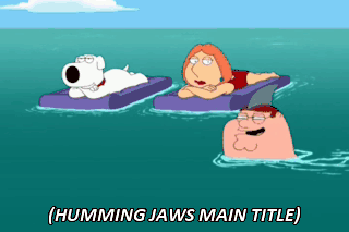 (HUMMING JAWS MAIN TITLE) I'm half shark and half Peter Don't come near me, I will eat you Peter, will you knock that off? It's getting annoying.