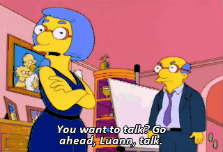 You want to talk? Go ahead, Luann, talk. Why don't you tell them one of your little bedtime stories, huh? Like the one about how rotten it is to be married to a loser.