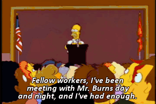 Fellow workers, I've been meeting with Mr. Burns day and night, and I've had enough. Strike! Strike! Strike! Strike! All in favor of a strike? Aye! All opposed? Nay. Who keeps saying that?