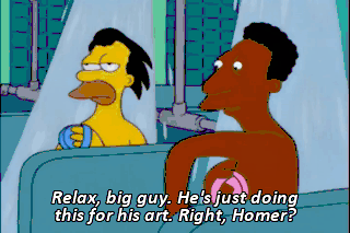 Relax, big guy. He's just doing this for his art. Right, Homer? Oh, yeah, art. Why won't you be art? Here he is. This is where the magic happens. Wonderful news, Homer. Is it about pies?
