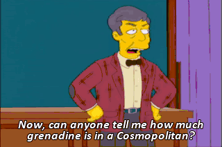 Now, can anyone tell me how much grenadine is in a Cosmopolitan? None. A Cosmopolitan is made with cranberry juice. Moe Szyslak, you old glass-wipe. Y'ello?