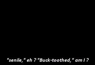 "senile," eh ? "Buck-toothed," am I ? "Bony arms," are they ? "Liver spots," did I ? "Chinless," will you ? His pink slip awaits your signature, sir.