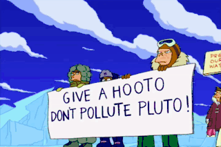 Here they come. Oh, I hope they read my sign. Bender's flying too low! And he's upside down! He must be talking on a cell phone.
