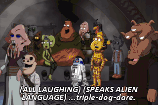 (ALL LAUGHING) (SPEAKS ALIEN LANGUAGE) ...triple-dog-dare. (SCREAMING) (ALL LAUGHING)