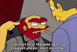 I cannot fit in the wee vent, ya Croquet-playin' mint muncher! Grease yourself up and go in, you-- you guff-speaking work slacker. Ooh, good comeback.