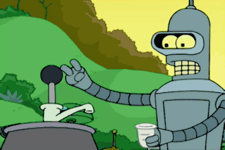 Crummy keg! It's completely tapped-- Oh, you're a robot. - Don't stop. - Ew! Attention, happening robots!