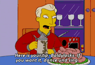Here is your tip, Baldylocks. If you want it, dance und sing. Oh! (SINGING IN GERMAN) (ALL CHEERING) More! More!
