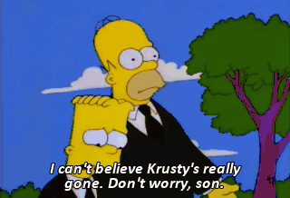 I can't believe Krusty's really gone. Don't worry, son. I'm sure he's up in heaven right now, laughing it up with all the other celebrities-- John Dillinger, Ty Cobb, Joseph Stalin. I wish I were dead.