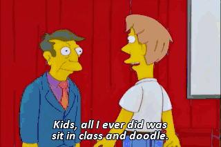 Kids, all I ever did was sit in class and doodle. Like this one. It's what your principal would look like as a woman. Fire, children! Hurry outside!