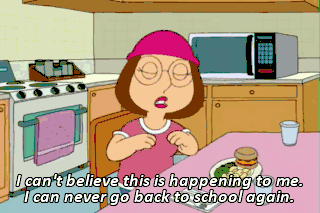 I can't believe this is happening to me. I can never go back to school again. Oh, yes, Meg, yes. Yes, everything was going swimmingly for you until this. Yes, this is the thing that will ruin your reputation.