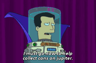 I must go now to help collect cans on jupiter. Peace out, y'all! Destroy all robots! Destroy all robots! Poor Bender. Be brave, my friend.