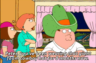 Peter, you've been wearing that giant foam cowboy hat for 8 months now. Please, for your family, take it off.