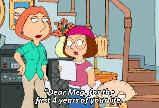 "Dear Meg, for the first 4 years of your life, "I thought you were a housecat." Dad! "Dear Stewie, get out." Oh, That's nice.