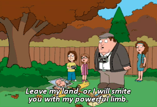Leave my land, or I will smite you with my powerful limb. What are you, nuts? Gimme that branch. Ow! Get off of me!