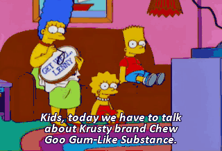 Kids, today we have to talk about Krusty brand Chew Goo Gum-Like Substance. We knew it contained spider eggs, but the hantavirus-- well, that really came out of left field.
