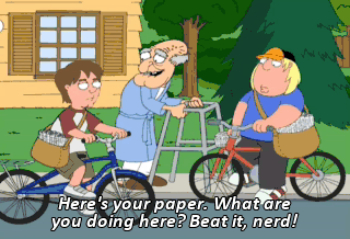 Here's your paper. What are you doing here? Beat it, nerd! Thank you. Would you like to come inside for a cupcake and a glass of wine? Shut up, old man.