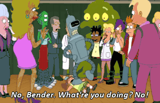 No, Bender. What're you doing? No! LEELA: Bender, stop! The robot has to go! (HEART MONITOR BEEPING) Huh? What's that? I took a nappie!