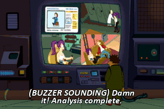 (BUZZER SOUNDING) Damn it! Analysis complete. Hey, I was nuzzling that. COMPUTER: Attributes transferred. Shoe size 12. Et cetera. Brace for emergency landing! What? We survived the crash? Oh, Fry!