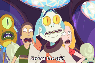 Secure the cell! Aaaah! Uh, hey! You know what's fun? Our gift shop. Why don't we proceed in an orderly -- Oh, dear god, no. They're codependent! Run! Oh!