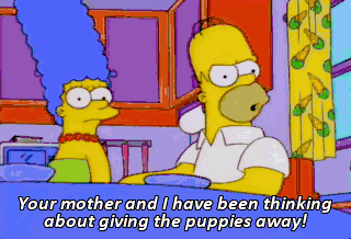 Your mother and I have been thinking about giving the puppies away! No! Mainly your mother. Is that what we do in this family? When someone becomes an inconvenience, we just get rid of them?