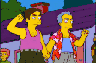 We're here! We're queer! Get used to it! You do this every year. We are used to it. Spoilsport. Oh, honey, think pink. Look. A salute to safe sex.