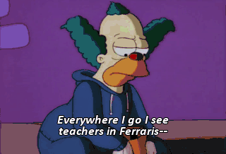 Everywhere I go I see teachers in Ferraris-- research scientists drinking champagne. I tried to drink a Coke on the bus, and they took away my pass. That's no life for a famous clown.