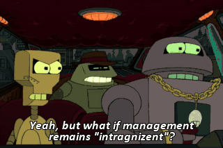 Yeah, but what if management remains "intragnizent"? From the context, it is clear what you mean. In that case, Clamps may have a little surprise for them. The clamps! Right?