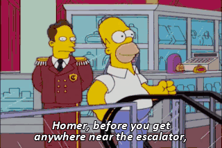 Homer, before you get anywhere near the escalator, you've gotta tie those shoes. Homer! Ow! So many shoppers! Damn this... Ow! Resilient economy! (SCREAMS IN PAIN)