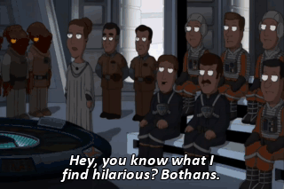 Hey, you know what I find hilarious? Bothans. Many Bothans died to bring us this information. (INHALES SHARPLY) Ooh!