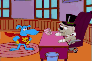 has threatened to destroy the city with her puke ray and-- Whaa! The mayor's barf is worse than his bite. Ah, le mot juste.