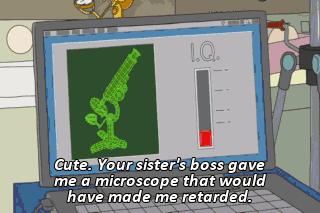 Cute. Your sister's boss gave me a microscope that would have made me retarded.