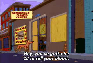 Hey, you've gotta be 18 to sell your blood. - Let's see some I.D. - Here you go, doll face. - Hmm. Okay, Homer. just relax. - Ow !
