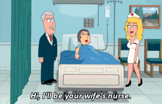 Hi, I'll be your wife's nurse. Would you excuse me a second? Okay, I'm back. Here we come, here we go